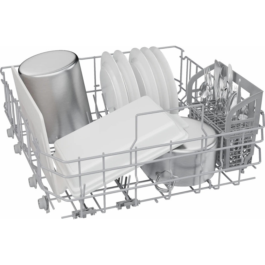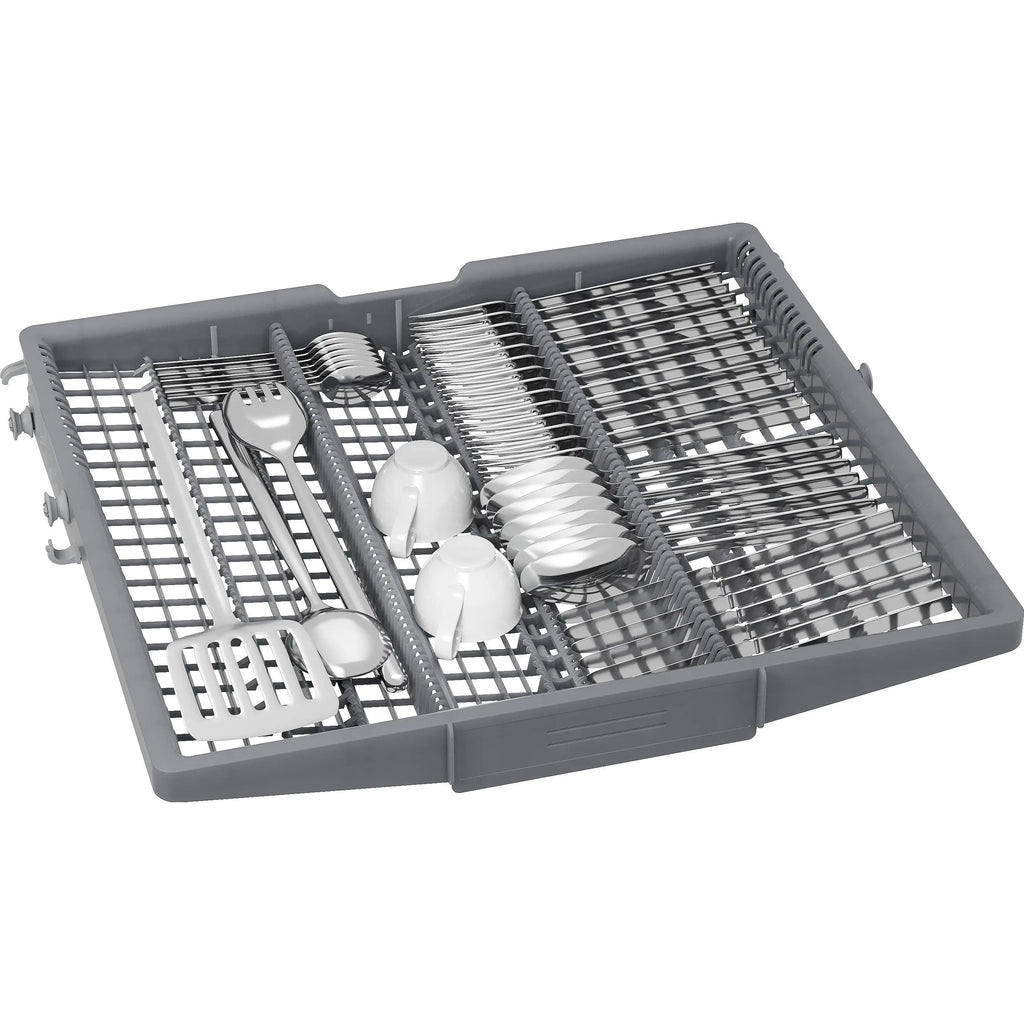 The 3rd rack provides extra space for flatware, large utensils and measuring cups. Its V shape leaves room below for tall items. *Compared to a Bosch dishwasher with 2 racks