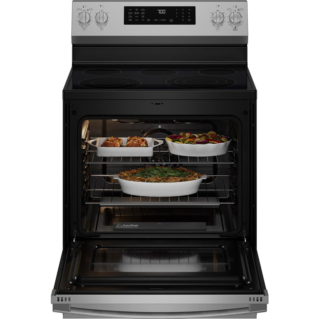 Revolutionize oven cleaning with the EasyWash™ Oven Tray. This enameled tray can be effortlessly removed for quick rinsing in the sink, or for larger messes, fits in our GE Appliances dishwashers.
