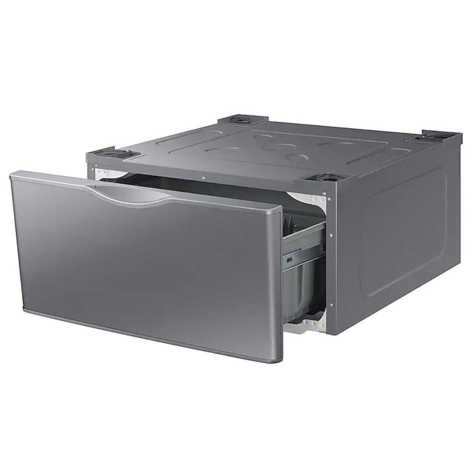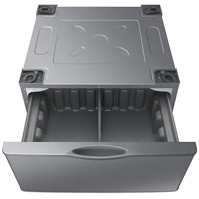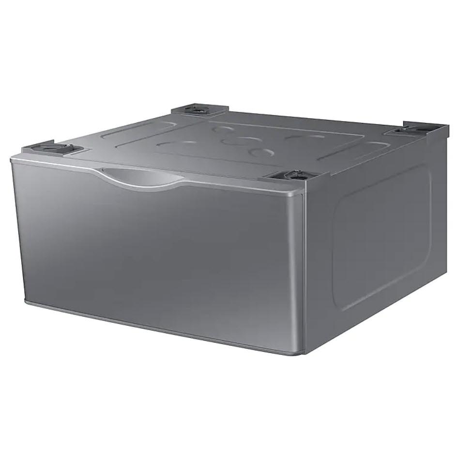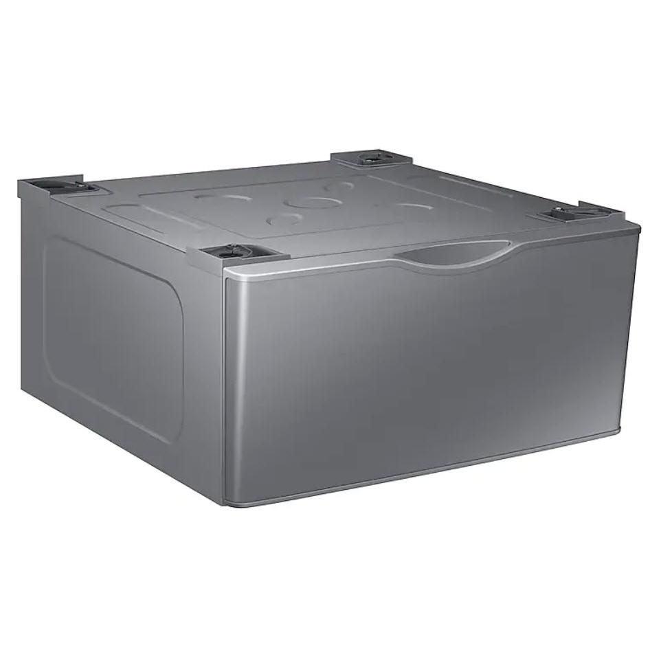 This Samsung 27” wide pedestal will allow you to lift your Samsung front load washer or dryer by more than... This Samsung 27” wide pedestal will allow you to lift your Samsung front load washer or dryer by more than a foot for a more convenient height. Tidy up your laundry space with an easily accessible built-in storage drawer. View more